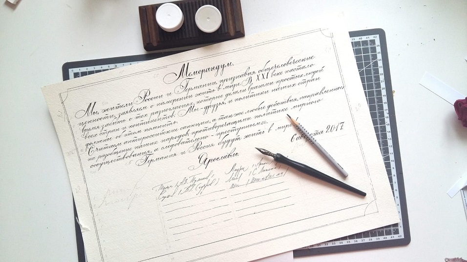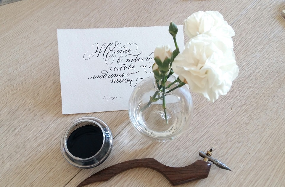 Однажды я решила, что хочу заниматься каллиграфией. У меня была высокая потребность научиться писать красиво. Пыталась учиться сама, смотрела уроки на YouTube и читала статьи в Интернете, но у меня не получалось. Нашла годовые курсы в Ярославле и пошла учиться. Через год получила свидетельство с правом обучения по теме «Русская каллиграфия и вязь».