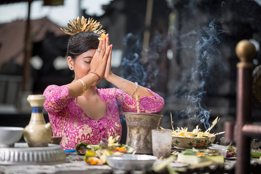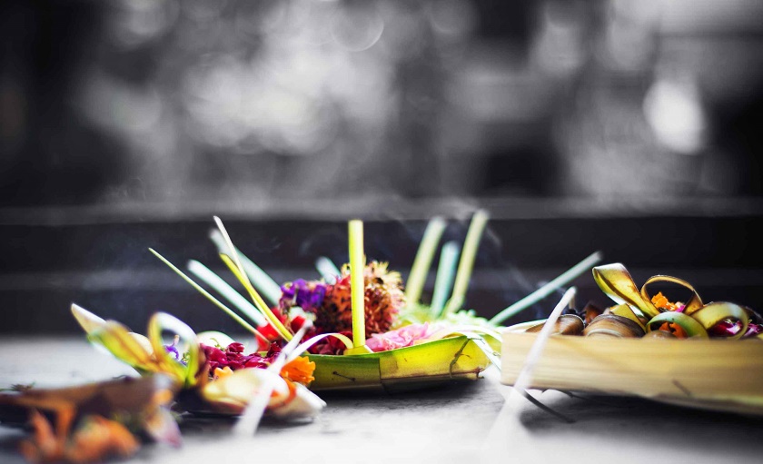 При таком отношении к религии вполне естественно, что балийское утро начинается не с кофе: первое, что делают островные жители, проснувшись и совершив омовение, — подносят богам что-то вроде дежурных даров. Порадовать высшие силы можно цветами, сладостями или вегетарианской пищей. И с самого утра дома, улицы и здания украшаются бесчисленными букетами из пальмовых листьев, свежих цветов и рисовых зерен. Ритуал «приветствия богов» начинается дома, продолжается на улице и завершается на работе. Подношения можно увидеть в магазинах, ресторанах, банках и государственных учреждениях. Трудовой день не начнется, пока не будет соблюден утренний ритуал.