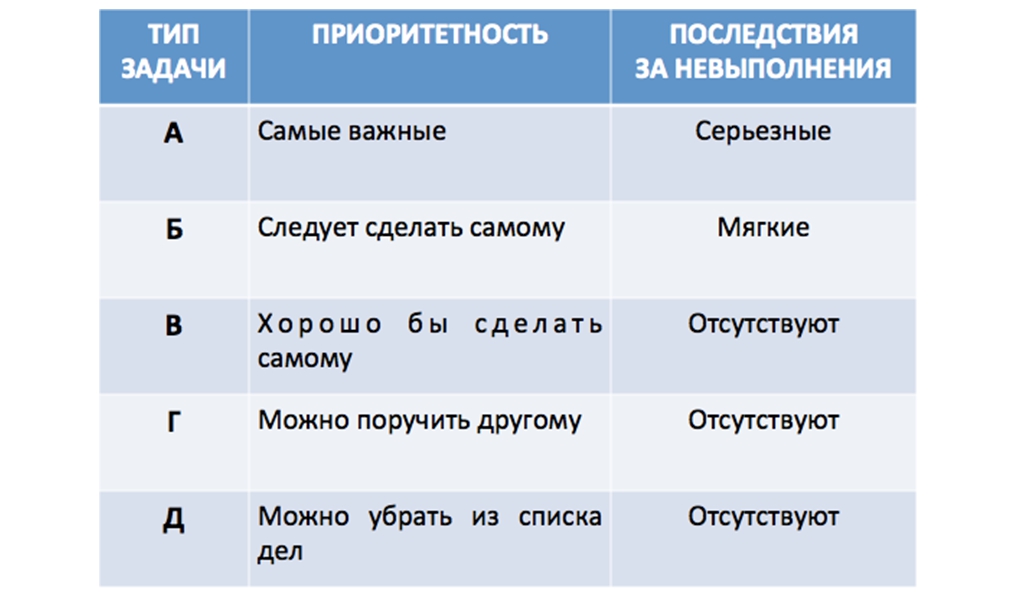 А — самое важное, серьёзные последствия за невыполнение. Б — следует сделать, но последствия достаточно мягкие. В — хорошо бы было сделать, но никаких последствий ожидать не стоит. Г — работа, которую можно поручить другому. Д — работа, которую можно убрать из списка дел. Главное правило этого метода: приступать к выполнению задачи А-1 сразу же и трудиться над ней, пока она не будет полностью завершена.