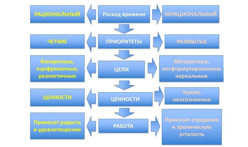 Когда в Россию только-только пришёл тайм-менеджмент, его основной идеей, воспевающейся на всех тренингах, была эффективность, когда вы за короткий промежуток времени должны были успеть сделать максимально возможное количество дел. По сути, это тот же принцип Парето, где 20 % дел дают 80 % результата. Но чаще всего такие методы, как принцип Парето, матрица Эйзенхауэра и прочие не помогают именно потому, что люди сами не знают — что для них главное. Или ещё хуже: вы понимаете, что ваши приоритеты на самом деле не ваши, а заложенные в вас родителями, обществом, понятиями о том, «как надо», но это не вы и не ваши желания. Подумайте, на какие важные дела у вас не хватает времени, и ответьте себе, а важные ли это дела. Действительно ли они имеют лично для вас настоящую ценность. И тогда вам станет понятно, можно ли справится с этим с помощью тренинга или тут нужна более деликатная работа, например, с психологом.