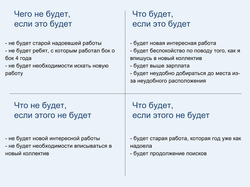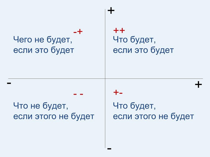 На первый взгляд кажется, что на вопросы 1 и 4, так же как на 2 и 3, ответы будут похожи. На самом деле это не совсем так. Наш мозг устроен таким образом, что потерю («чего не будет») воспринимает иначе, чем приобретение («что будет»). Конечно, часть ответов может повториться, но, задавая вопрос по-другому, вы можете найти неочевидные на первый взгляд плюсы или минусы данного решения.