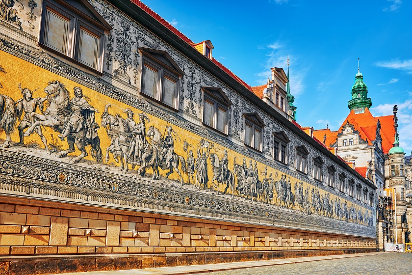 Кстати, если уж речь зашла о военных разрушениях, то стоит отметить, что только чудом не было утрачено во время бомбардировок панно «Шествие князей» — для своей эпохи не просто произведение искусства, а высокотехнологичная тончайшая работа. Фарфоровая мозаика из 25 тысяч плит сложена в 100-метровую картину, повествующую о главах династии саксонских правителей. Полюбоваться на панно можно в Дрезденском замке.