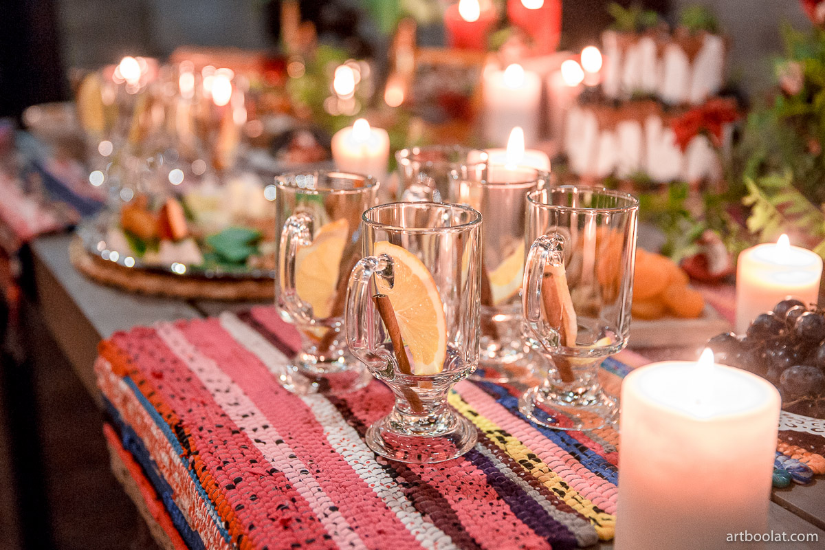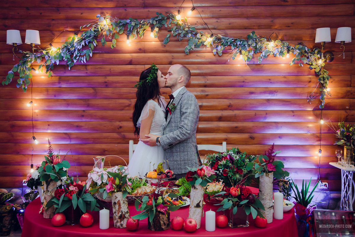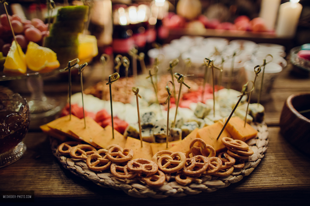 — На моих осенних свадьбах очень прижилась традиция глинтвейн-бара, или autumn-бара. Это такая своеобразная вариация «сырного бара», но в углубленном и более интересном и красивом варианте. Свадьба открывается традиционным уютным фуршетом, который позже, когда гости уже расселись за столы, дополняется сырами, горячим шоколадом и глинтвейном, фруктами и орехами, роскошным природным оформлением. Действует такой бар весь вечер. Обязательно жжем много свечей, вешаем лампочки Эдисона, раскладываем пледы и даже ставим уличные обогреватели, ведь бар обычно располагается на террасе или на улице. Гости весь вечер могут проводить время у такого бара: лакомиться вкусностями, пить глинтвейн, укутавшись в теплый плед, беседовать, фотографироваться и танцевать. Поздним вечером к бару присоединяется свадебный торт — лучше места и атмосферы для его разрезания и представить нельзя.