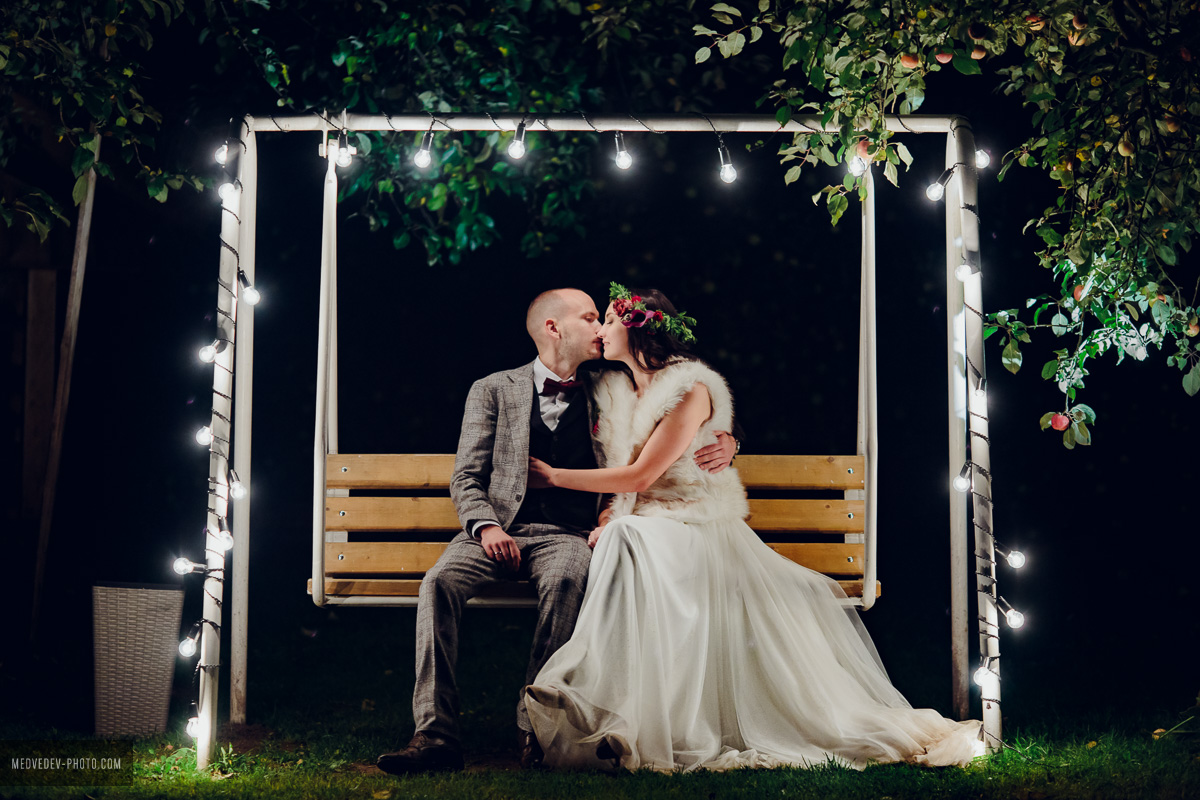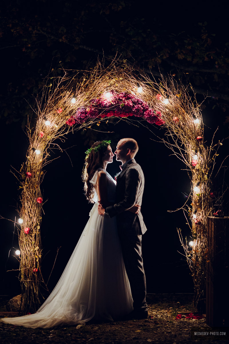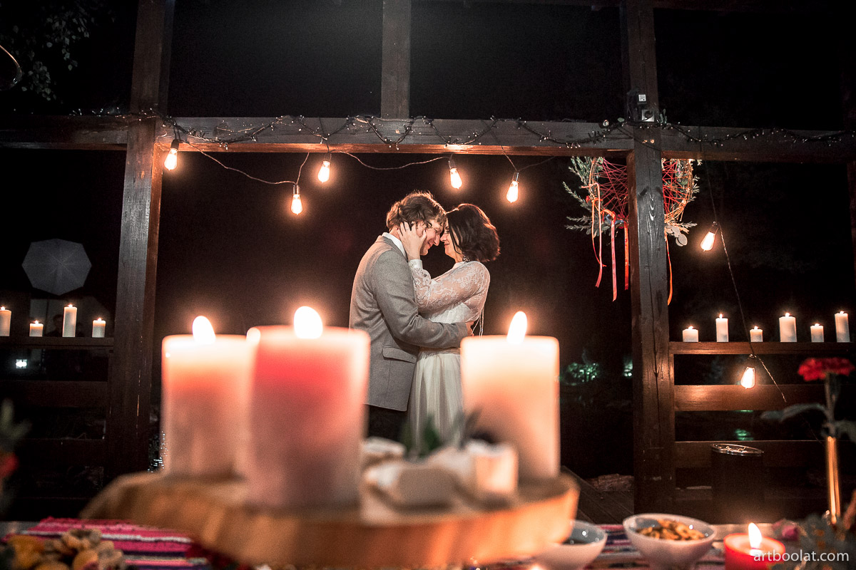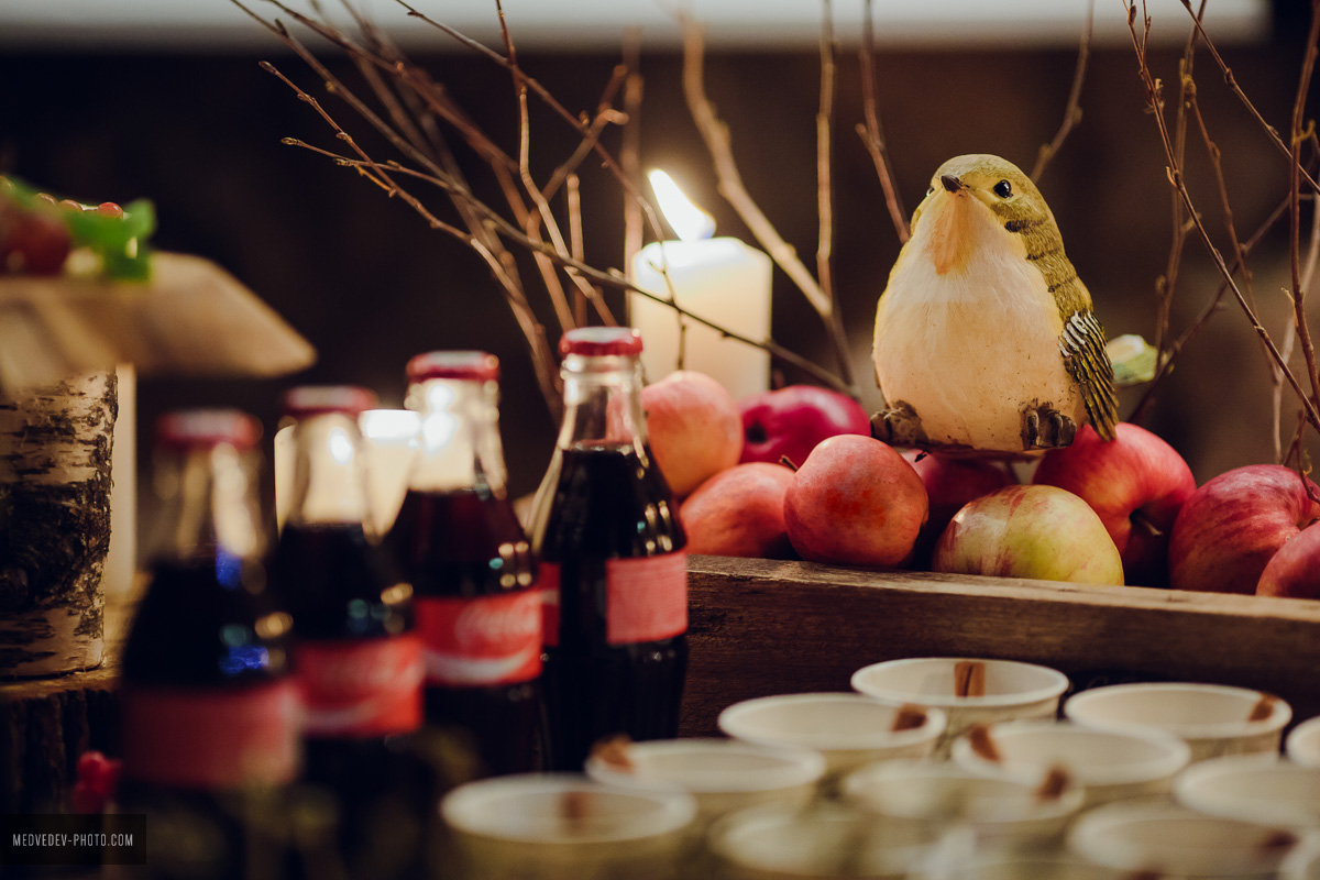 — На моих осенних свадьбах очень прижилась традиция глинтвейн-бара, или autumn-бара. Это такая своеобразная вариация «сырного бара», но в углубленном и более интересном и красивом варианте. Свадьба открывается традиционным уютным фуршетом, который позже, когда гости уже расселись за столы, дополняется сырами, горячим шоколадом и глинтвейном, фруктами и орехами, роскошным природным оформлением. Действует такой бар весь вечер. Обязательно жжем много свечей, вешаем лампочки Эдисона, раскладываем пледы и даже ставим уличные обогреватели, ведь бар обычно располагается на террасе или на улице. Гости весь вечер могут проводить время у такого бара: лакомиться вкусностями, пить глинтвейн, укутавшись в теплый плед, беседовать, фотографироваться и танцевать. Поздним вечером к бару присоединяется свадебный торт — лучше места и атмосферы для его разрезания и представить нельзя.