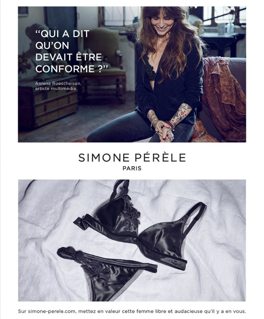 Каков тогда сегодня, в эпоху жарких дебатов в обществе, может быть месседж исторической марки женского белья? Бренд Simone Pérèle (руководит домом Матье Гронде, а Стефани Перель отвечает за коммуникации, оба внуки основательницы бренда) решил отойти от сексуальности и сделать акцент на нижнем белье для повседневной жизни. Их рекламные плакаты в октябре прошлого года были представлены в виде диптиха: в одной части изображена женщина в реальной жизни, у которой виден из-под одежды маленький уголок кружева или часть бретельки, а во второй — изображение белья в стиле натюрморта. Сильный маркетинговый ход для этого семейного французского предприятия, созданного в 1948 году.
