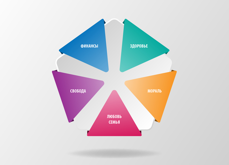 Не нужно высчитывать проценты, насколько деньги важнее любви, а здоровье важнее морали или свободы. Это слишком субъективно и может привести к неверным выводам. Пять сторон нашей жизни самостоятельны и абсолютны. Схема нужна для того, чтобы разобраться в бесконечном ворохе мыслей, структурировать процесс принятия решения, сделать выбор более очевидным.