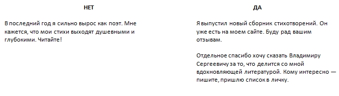 Чем больше публикаций, тем меньше ценность каждой по отдельности. Старайтесь говорить о своих успехах не чаще, чем раз в неделю. Если достижений слишком много, делайте списки. Но лучше выбирайте самые значимые.