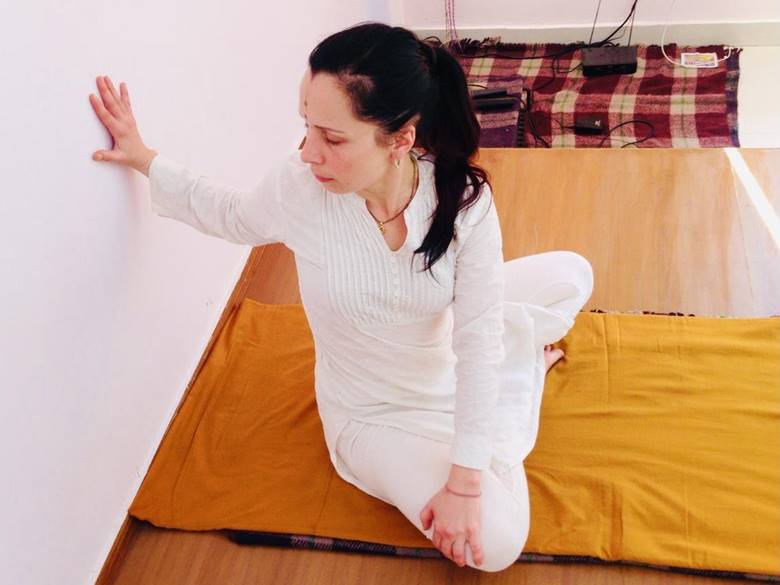 И в заключении Арда Матьяндрасана или скручивание в положении сидя, эту позу рекомендую выполнять с помощью стены в терапевтическом стиле.