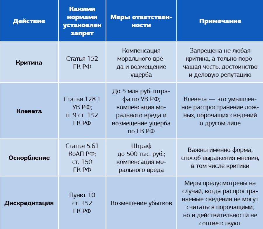 Законодательство защищает граждан от необоснованной критики, клеветы и дискредитации двумя способами: