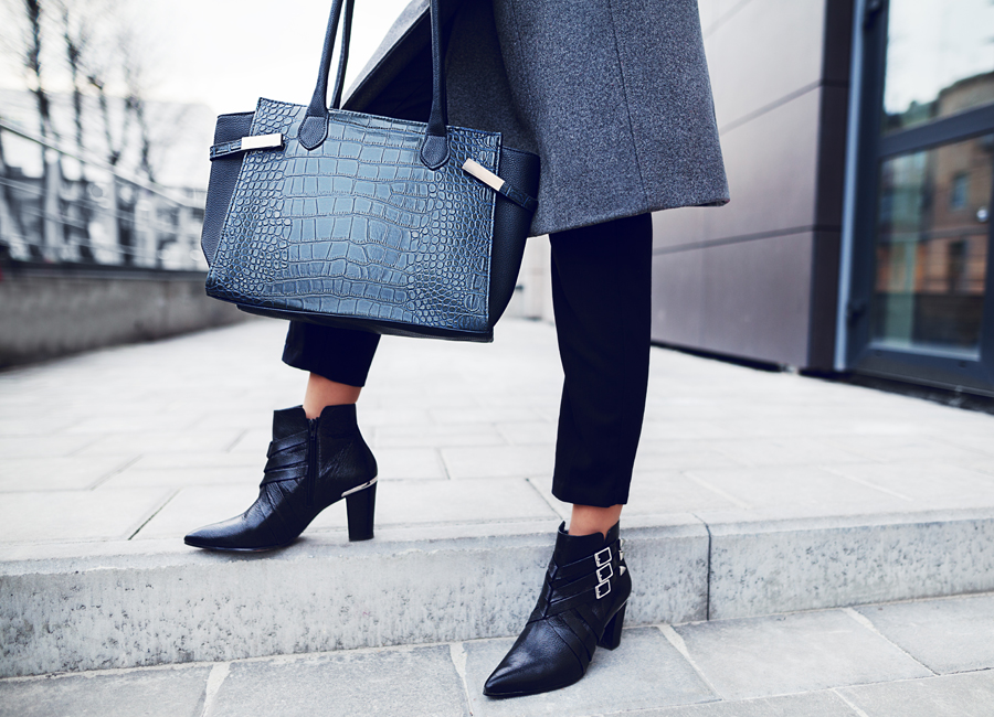Завершают такой образ обычно туфли или сапоги на среднем каблуке — он придает ноге особое изящество, при этом в такой обуви при должной привычке можно стоять или ходить целый день. Но в идеале это, конечно же, туфли на шпильке — нюдовые, черные или точно в цвет платья.