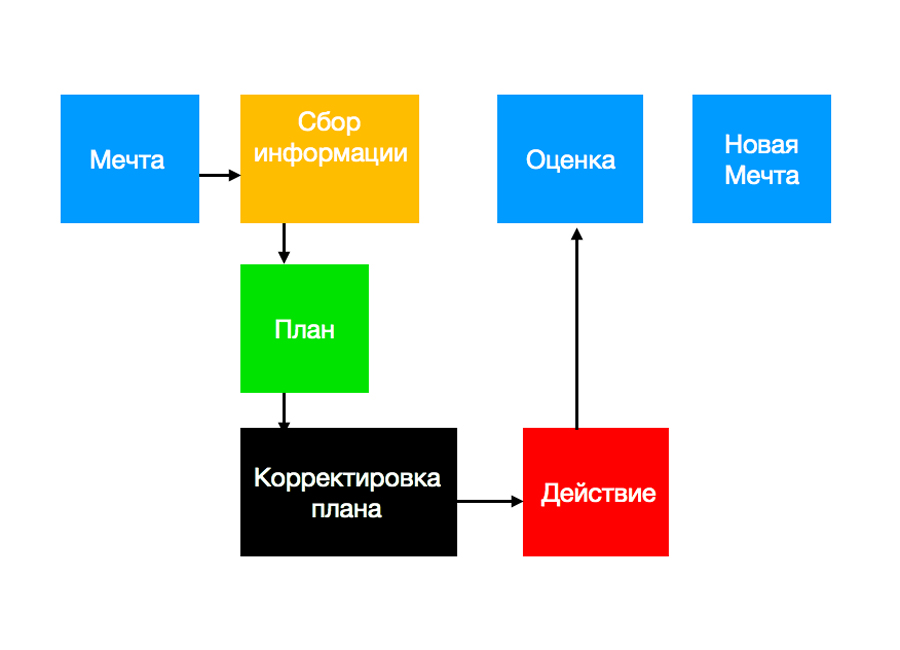 Все мечты (которые не попали на кладбище, а исполнились) проходят такой цикл: 1. Мечта ⇒ 2. Сбор информации ⇒ 3. План ⇒ 4. Корректировка плана ⇒ 5. Действие ⇒ 6. Оценка.