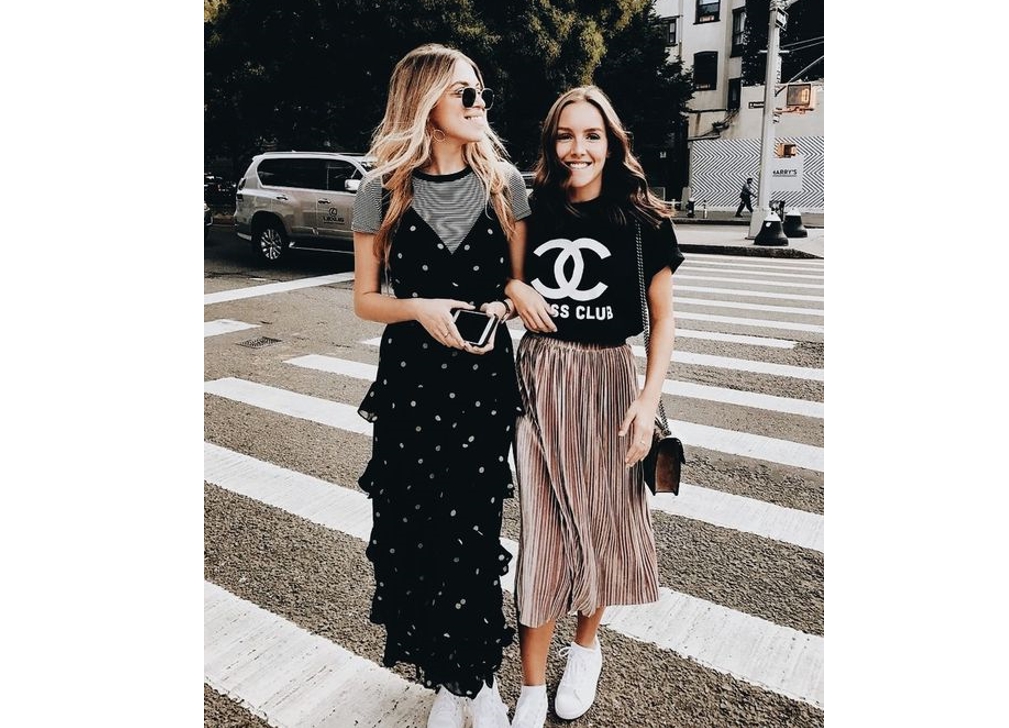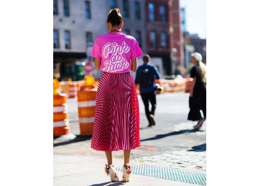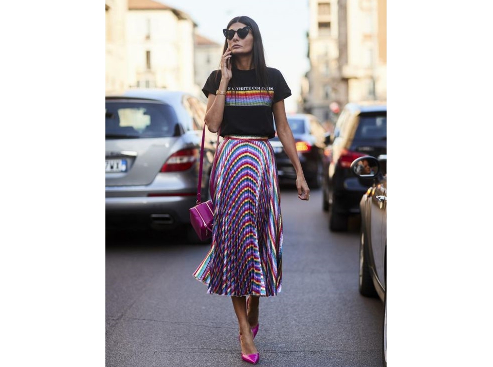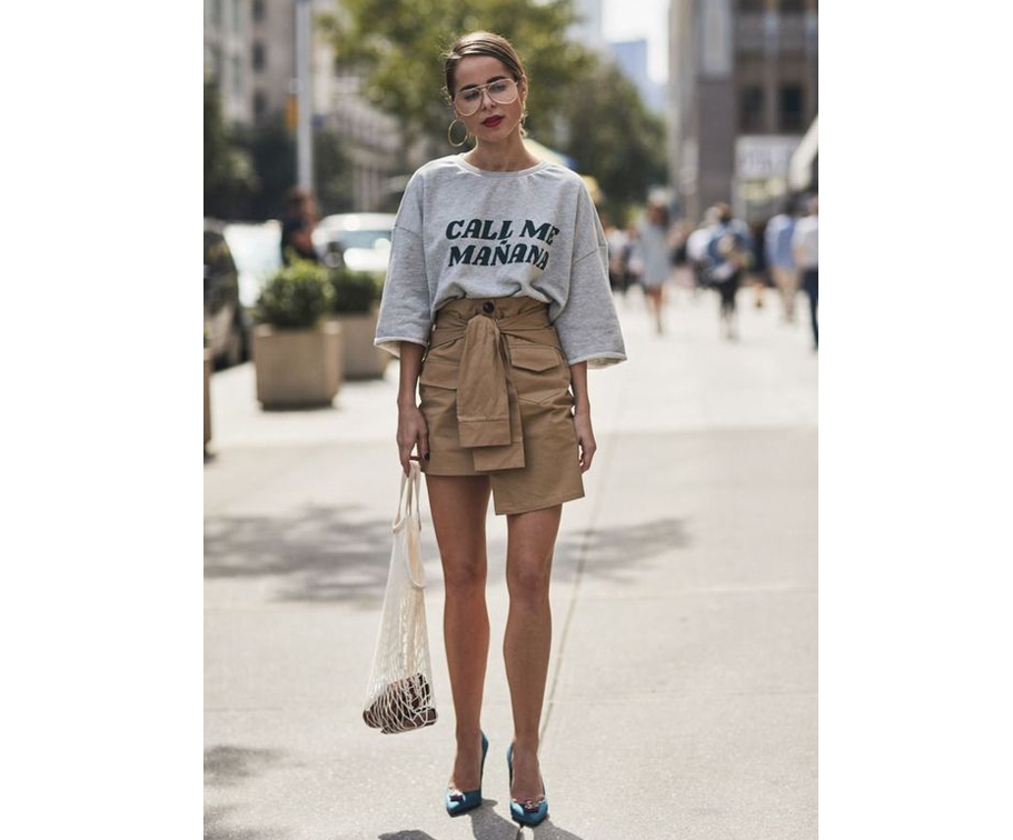Также футболки носим с юбками. Это могут быть мини, миди, не советую макси — в этом сезоне не совсем актуальная модель. Опять же выбираем деним, летящие модели, юбки — плиссе, с запахом.