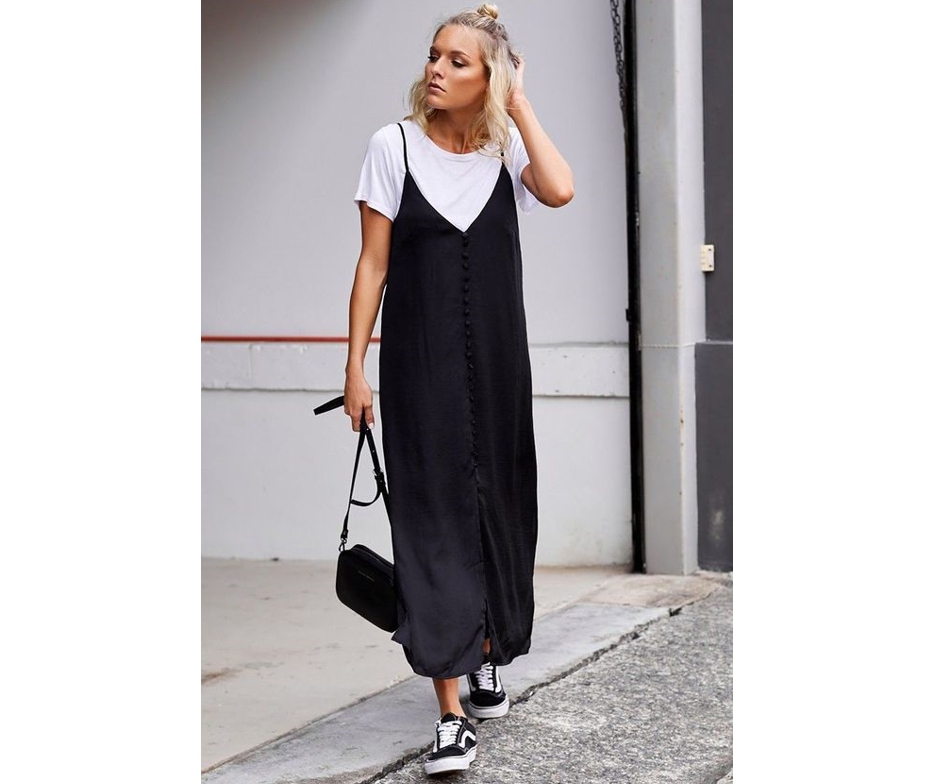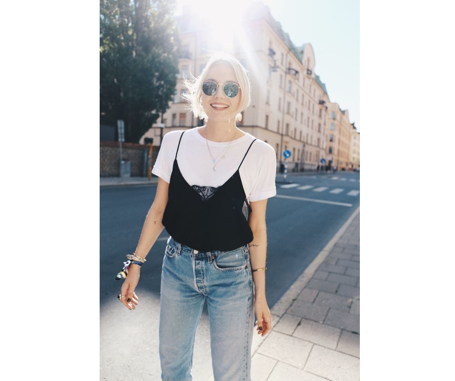 Экспериментируем и не останавливаемся на достигнутом! Платью в бельевом стиле и топу можно придать более повседневный вид, надев под низ все ту же футболку.