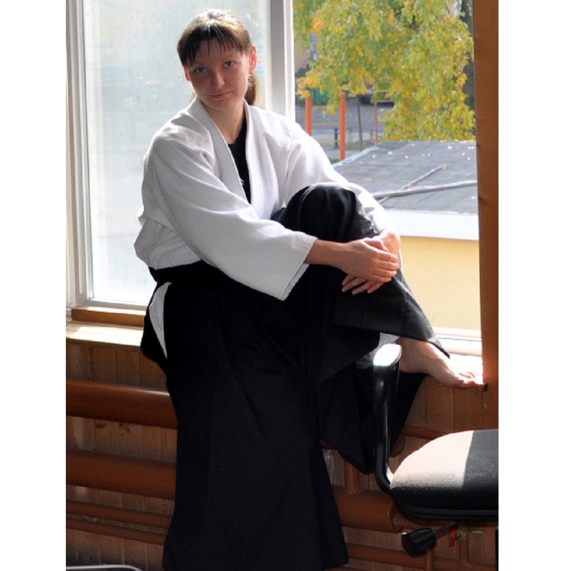 На тренировках я не надеваю хакаму именно потому, что она скрывает движения, а у меня, как тренера, обратная задача — максимально понятно объяснить и продемонстрировать технику приема и передвижения ног, чтобы ученицам было понятнее, как работает прием.