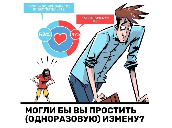 53% всех опрошенных отметили, что готовы простить одноразовую измену. 47% — категорически нет.
