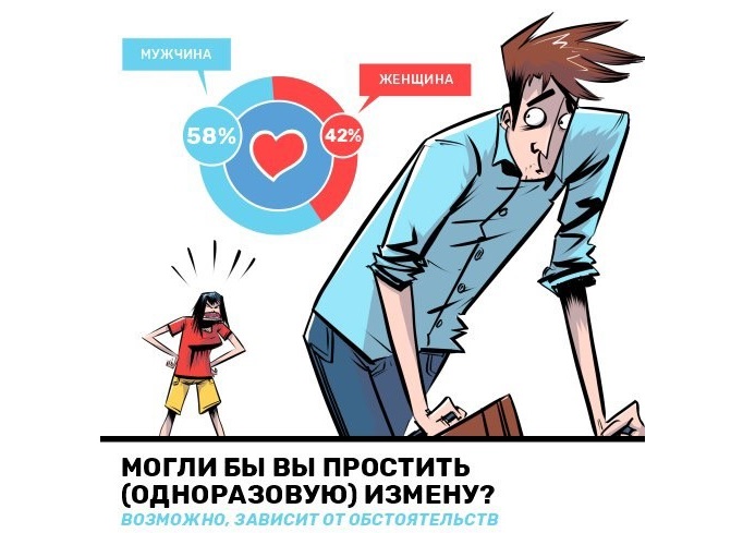 Опросы показали, что 42% женщин и 58% мужчин готовы простить одноразовую измену.