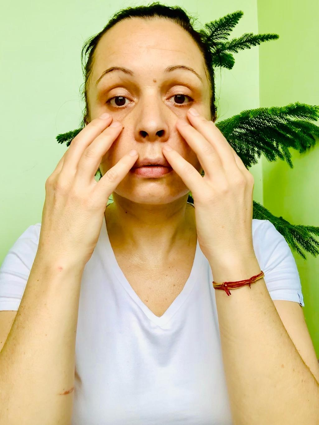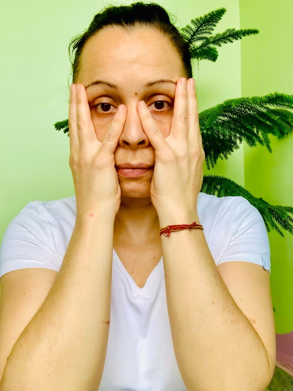 Разотрите ладони и положите их на щёки так, чтобы кончики мизинцев обеих рук касались переносицы с внешних краев. Расстояние между мизинцами и безымянными пальцами 3-5 см, то есть между пальцами помещается глаз. Надавливая внешней линией мизинцев перемещайте пальцы начиная с переносчицы вниз, по крыльям носа до ноздрей. Повторите движение 8 раз.