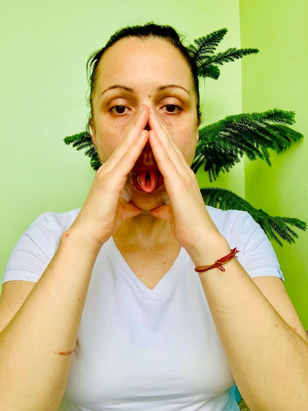 Поместите обе руки на лицо таким образом, как будто вы собрались кричать «Ау». Слегка надавите кончиками указательных пальцев на переносицу, большие пальцы поместите на щёки внизу ближе к челюсти.