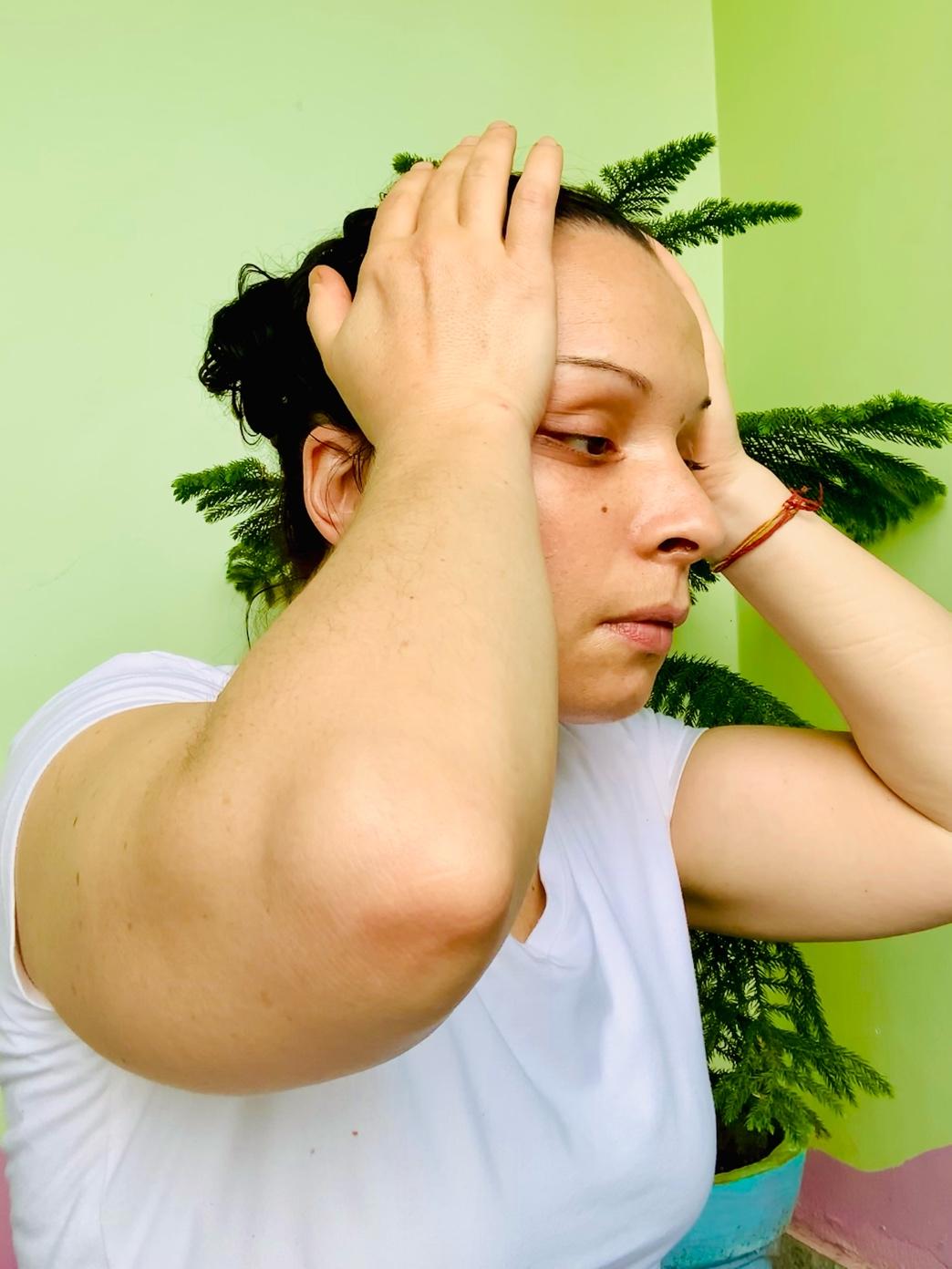 Поместите основание запястий к вискам. Используйте бугор ладони под большим пальцем для массажа височной области, начните с внешних кончиков глаз и доведите руки до начала волосяного покрова. Рассчитайте комфортную силу надавливания для себя, чтобы получить удовольствие во время практики. Повторите движение 8 раз.