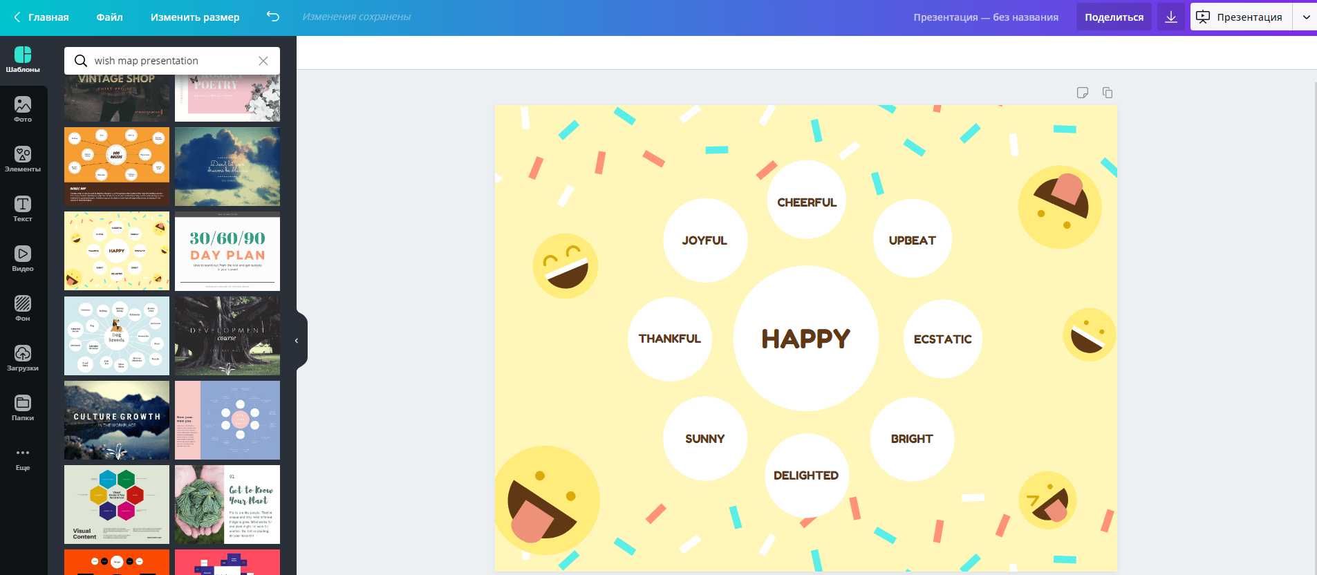 Здесь слева от макета вы увидите набор шаблонов для карты желаний. Выберите любой понравившийся по структуре: цвета, изображения и текст легко можно изменить.