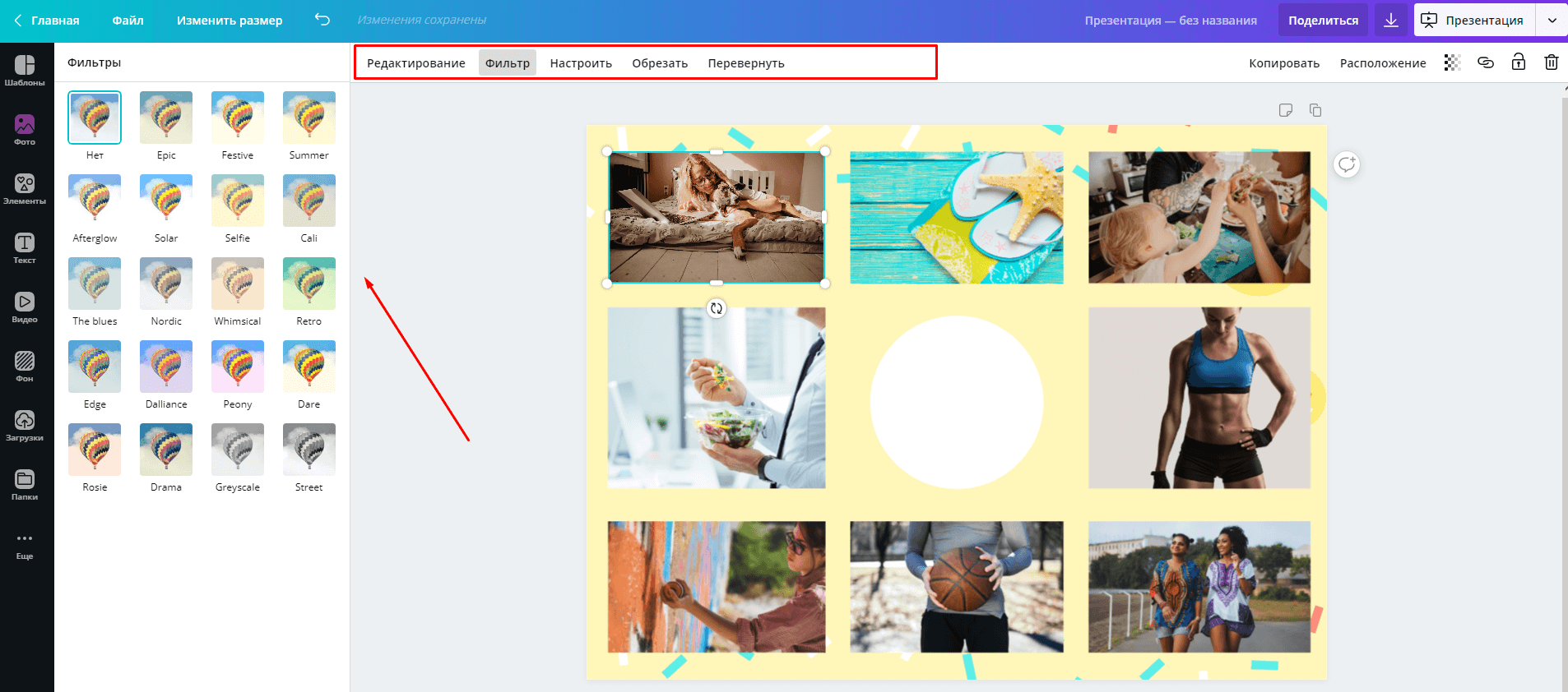 Чтобы карта желаний смотрелась красиво, отредактируйте все изображения в одном стиле. Для этого кликните по фото и используйте настройки, которые появятся при этом над макетом.