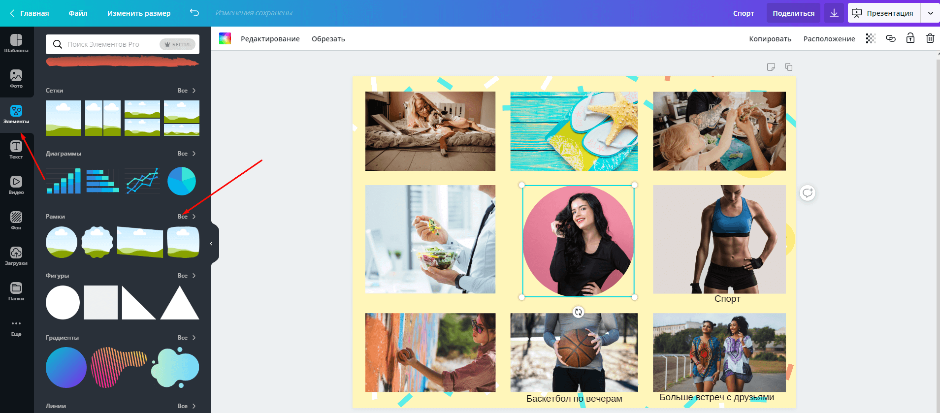 С помощью графических элементов можно сделать карту интереснее, ярче, но использовать их совсем не обязательно. В нашем случае использована рамка из раздела «Элементы» на левой панели — в круглую рамку мы поместили фото в центре карты.
