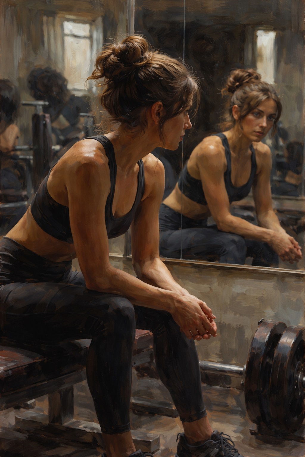 И это особенно хорошо видно в тренажёрном зале. Женщина приходит, переодевается, надевает наушники, выбирает вес, подходит к тренажёру — и всё выглядит собранно и правильно. Есть программа, есть цель, есть дисциплина. Она тренируется честно и усердно. Тело становится сильнее, форма улучшается.