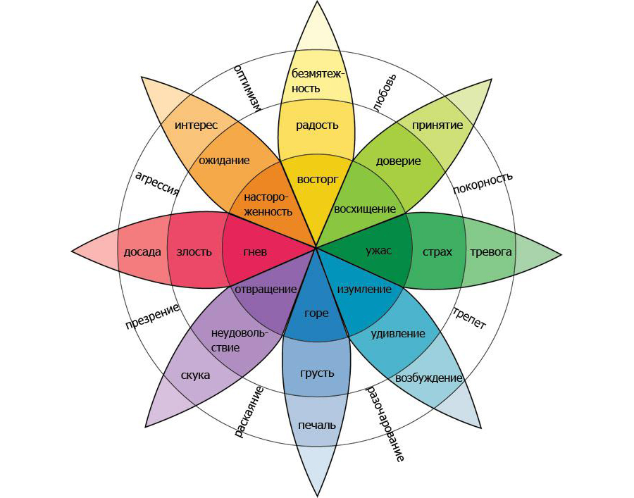 Из практических инструментов может помочь схема Келлермана-Плутчика. В ней авторы отразили целый спектр эмоций и состояний. Полезно держать схему при себе и время от времени подсматривать в разноцветный круг, стараясь понять свои чувства.