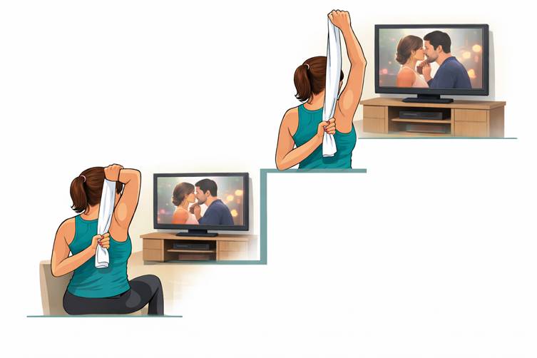 одна рука поднимается вверх и сгибается за головой, удерживая полотенце.